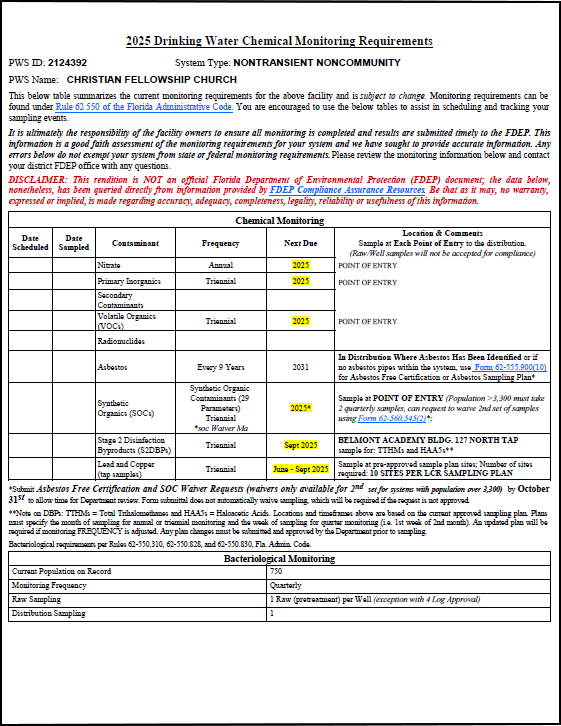 Veteran operators reconize these letters for their original FDEP Monitoring Letters formatting. This is a proven, time-tested format that has delivered results year after year. If it's not broken, don't fix it - this is a principle we uphold. Whether a "Large Community System" such as the JEA MAJOR GRID Community Water System of Duval County, a Small Community Water System, or a Nontransient Noncommunity Water System such as CHRISTIAN FELLOWSHIP CHURCH in Columbia County, (the one shown) we have the bases covered. We go the extra mile, in that our algorithm highlights the date of any analyte that is scheduled for the current year, providing an at-a-glance overview of your upcoming testing requirements. As previously stated, the data comes directly from FDEP published sources. Monitoring Letters are an integrated part of the Operators Desktop Application: SyzInTech - AquaLogic Pro. |